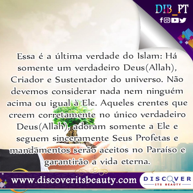 96. Essa é a última verdade do Islam: Há somente um verdadeiro Deus(Allah), Criador e Sustentador do universo. Não devemos considerar nada nem ninguém acima ou igual à Ele. Aqueles crentes que creem corretamente no único verdadeiro Deus(Allah), adoram somente a Ele e seguem sinceramente Seus Profetas e mandamentos serão aceitos no Paraíso e garantirão a vida eterna.