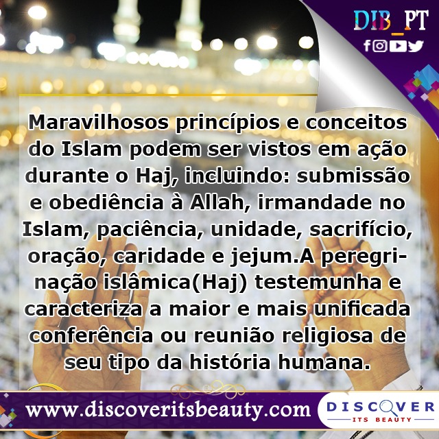 111. Maravilhosos princípios e conceitos do Islam podem ser vistos em ação durante o Haj, incluindo: submissão e obediência à Allah, irmandade no Islam, paciência, unidade, sacrifício, oração, caridade e jejum. A peregrinação islâmica(Haj) testemunha e caracteriza a maior e mais unificada conferência ou reunião religiosa de seu tipo da história humana.